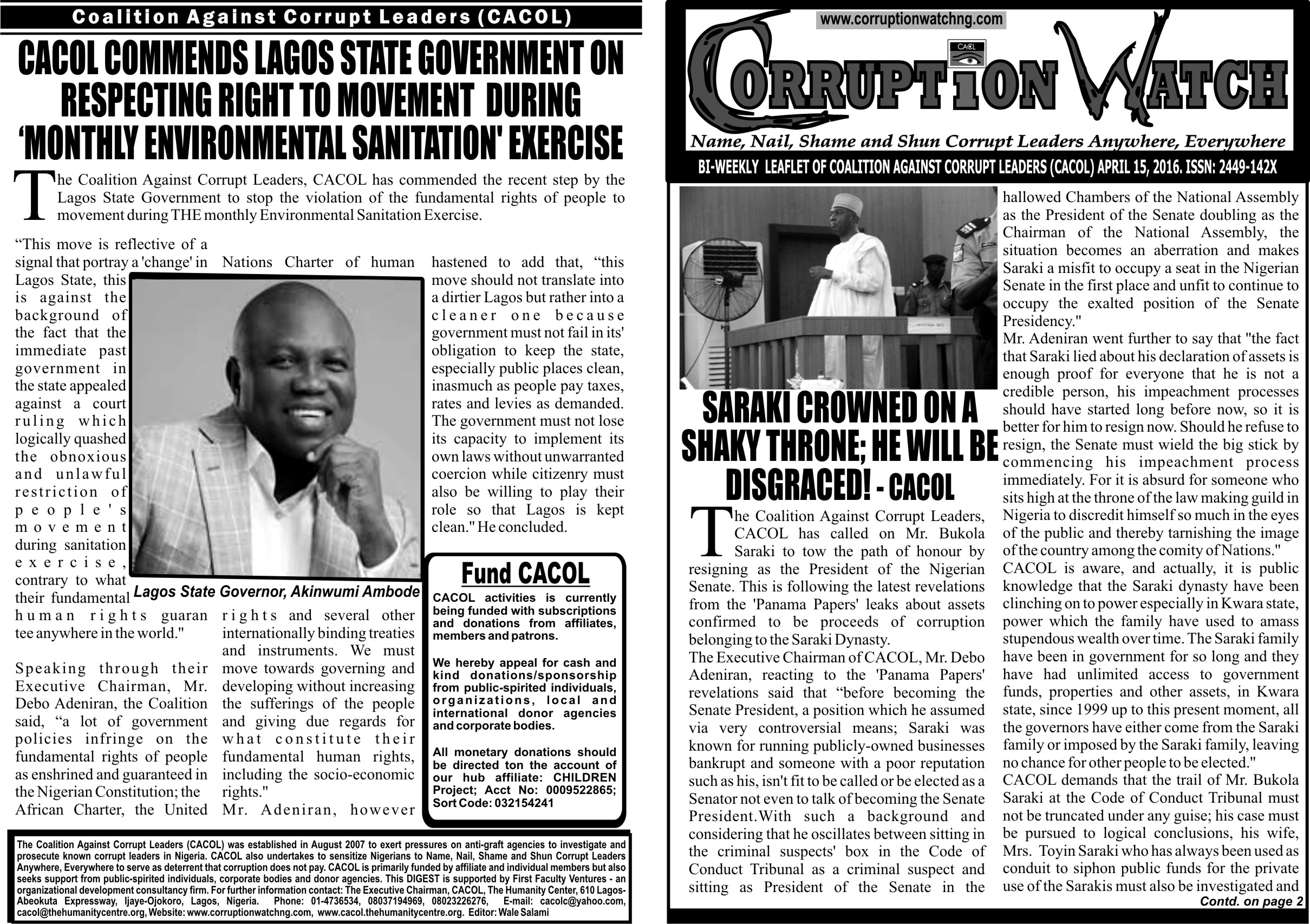 Being the Valedictory Tribute to Dr. Tunji Braithwaite as delivered by Mr. Debo Adeniran, the Executive Chairman of Coalition Against Corrupt Leaders, CACOL, at his Funeral Programmer, 24th-28th of April, 2016
